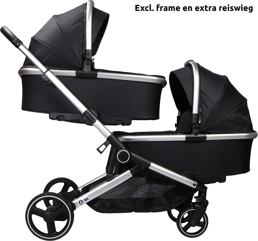 Op het frame van de Amigo duowagen (niet meegeleverd, apart verkrijgbaar) kan je één of twee reiswiegen plaatsen. Zo kun je er ook gemakkelijk een tweeling kinderwagen van maken! De reiswieg kan zowel naar binnen als naar buiten op het frame geplaatst worden en je kan daarnaast ook kiezen of je hem onder of boven wil plaatsen.