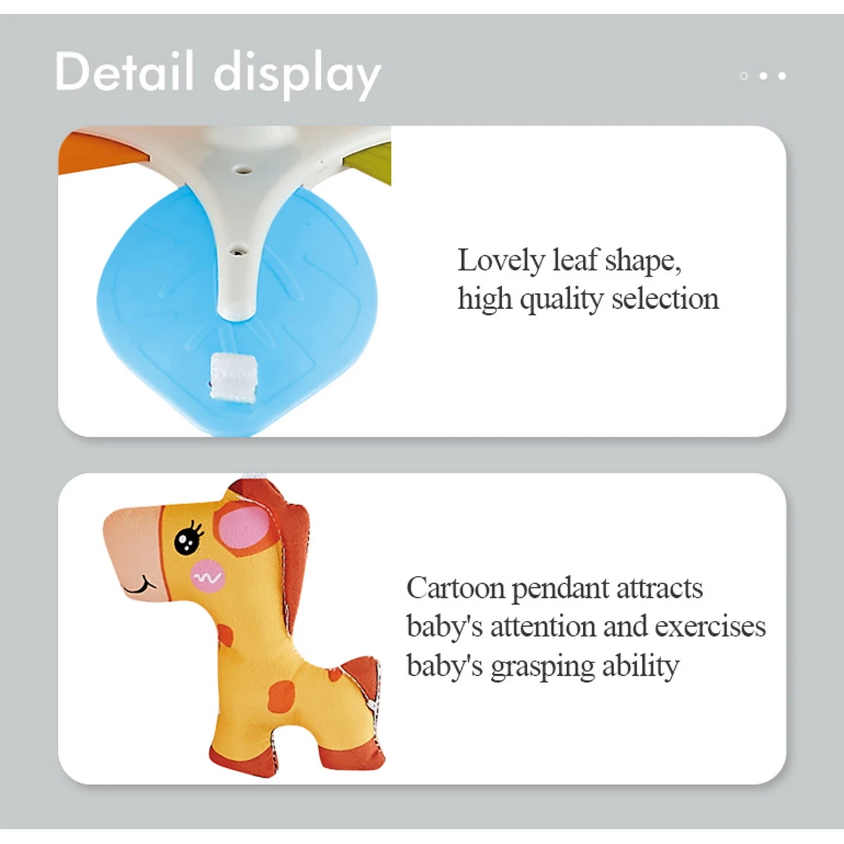 De leuke kleurtjes en schattige diertjes trekken de aandacht van je kleine en dragen bij aan de motoriek en de visuele ontwikkeling van je kindje. De dino, de giraffe en de zebra zorgen voor veel plezier tijdens de wandeling met je baby. De vrolijke vriendjes zitten vast aan kleurrijke blaadjes met meerdere texturen.